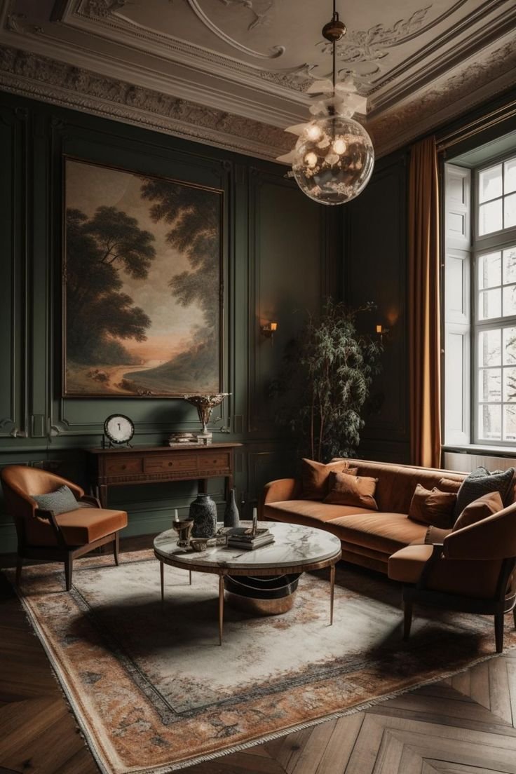 Lorsque l’on pense à la décoration d’un espace de vie, il est essentiel de créer un lieu à la fois esthétique et fonctionnel. La pièce illustrée est un exemple parfait de la manière dont les éléments classiques peuvent être fusionnés avec des touches contemporaines pour former un salon chaleureux et accueillant. Les murs vert forêt et le mobilier aux teintes de terre se marient pour créer un cadre intime et sophistiqué, idéal pour ceux qui cherchent à élever leur décor intérieur.
